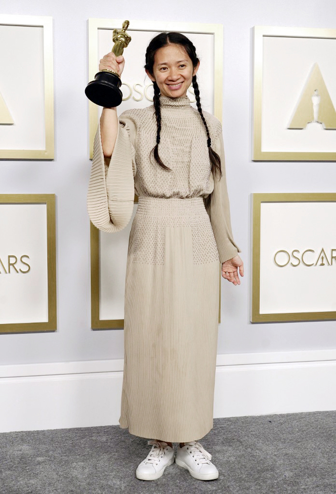 Ở lễ trao giải Oscar lần thứ 93, Chloé Zhao chọn phong cách trang nhã, không màu mè, hướng đến tinh thần tự nhiên. Cô diện đầm màu be nhạt của Hermès nằm trong bộ sưu tập Thu Đông 2021 của hãng mốt Pháp, kết hợp sneakers trắng tạo vẻ năng động. Cô thắt bím tóc hai bên, khuôn mặt không trang điểm. Theo Vogue, rất hiếm ngôi sao để mặt mộc đến Oscar. Phong cách của nữ đạo diễn 39 tuổi cho thấy sự tự tin tuyệt đối.